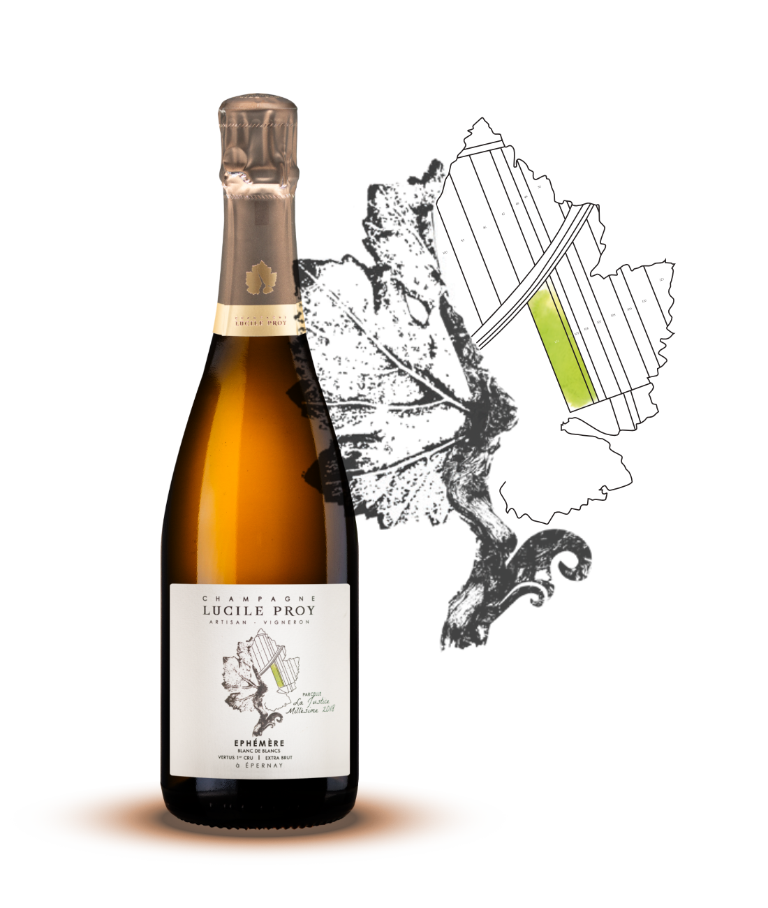La première édition, Éphémère 2018, est un Blanc de Blancs issu de la parcelle La Justice, située au pied de Vertus 1er Cru. Plantée en 1961, cette vigne vibre d’une énergie contenue : elle demande temps, patience et silence.