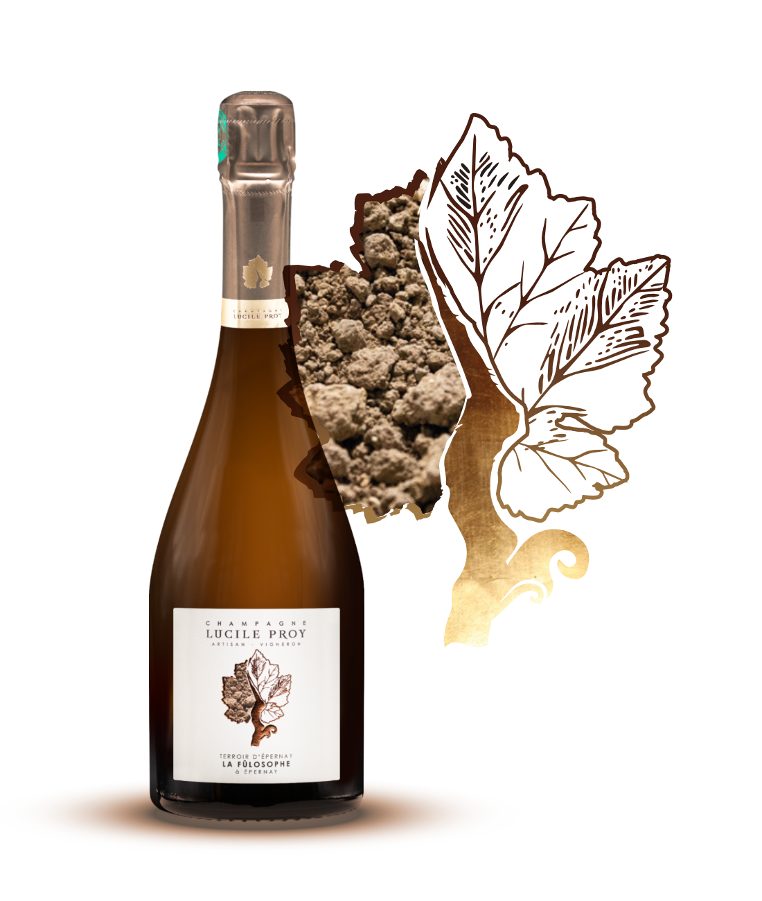 Mais la Fûlosophe est aussi une histoire en mouvement : celle des vignes d’Épernay, que j’écris aujourd’hui avec la même exigence qu’elles m’imposent. Elle est à inventer, comme un futur déjà enraciné. Sur son étiquette, une feuille de vigne renferme l’image du sol : celui qui soutient, inspire, élève. Feuille et terre, surface et profondeur : la vigne comme une vérité à contempler autant qu’à déguster.